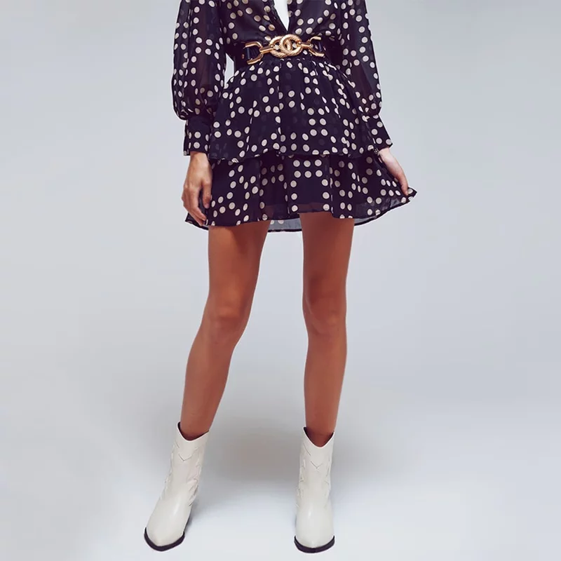 Gonna in chiffon leggero a pois. Modello morbido in tessuto semitrasparente con balze. Abbinala alla camicia maxi pois uguale per un look super chic e fashion. Il tocco in più? La cintura in ecopelle con dettaglio oro in strass per un look super luminoso.